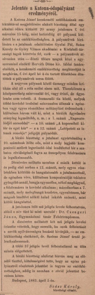 A Katona József kecskeméti szülőházának emléktáblával megjelölésére alakult bizottság által egy alkalmi ódára kitűzött 20 arany jutalomra f. évi márczius 15-kéig, mint határidőig 40 pályamű küldetett be az emlékbizottsághoz. A pályaművek bírálására s a jutalmak odaítélésére Gyulai Pál, Szász Károly