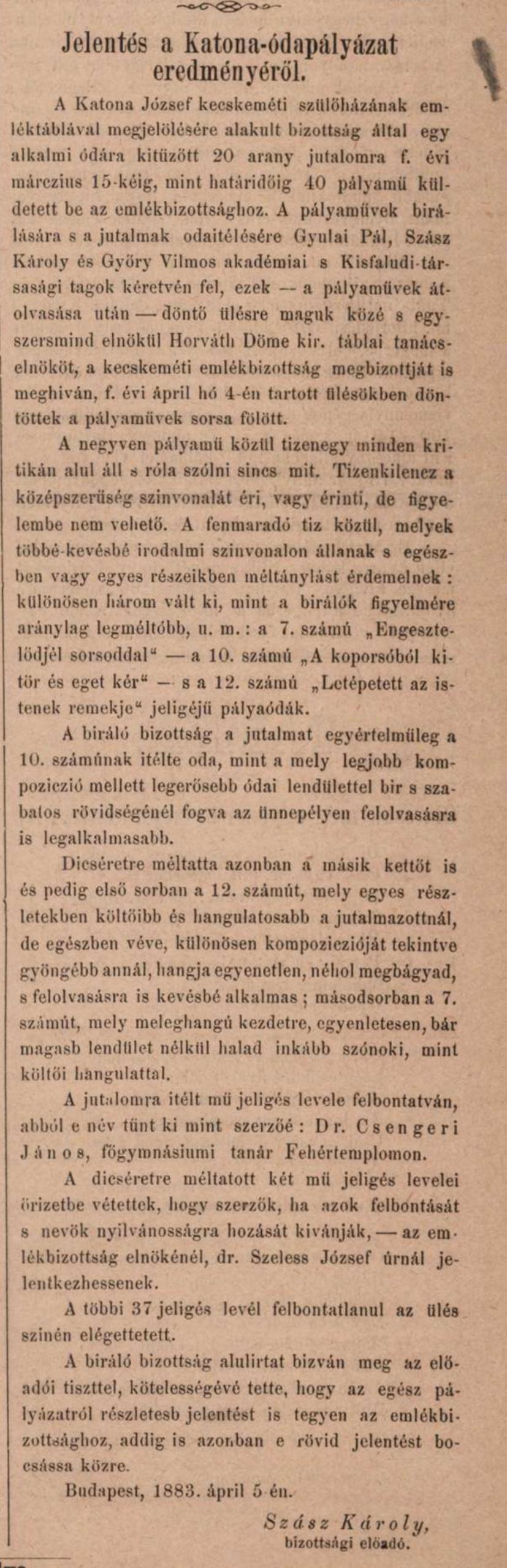 A jutalomra itélt mű jeligés levele felbontatván, abból e név tűnt ki mint szerzőé: Dr. Csengeri János,
